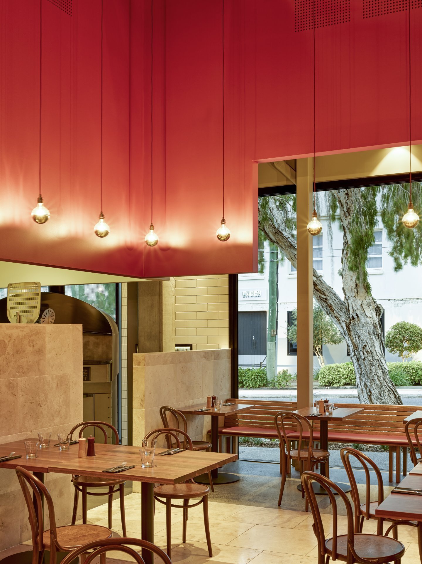 The central volume is the focus of the dining space. A tall red room is decorated by a fringe of mirrored pendant lights. The gently moving lights create subtle interference patterns which seem to breath as the pendants sway in the breeze.